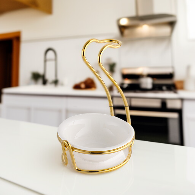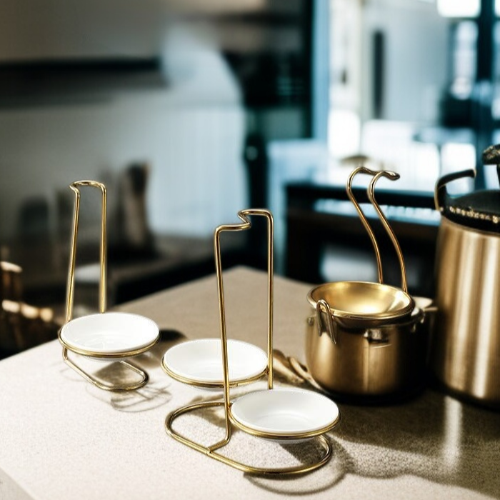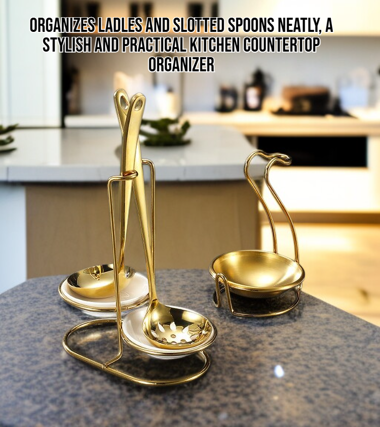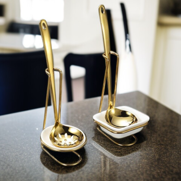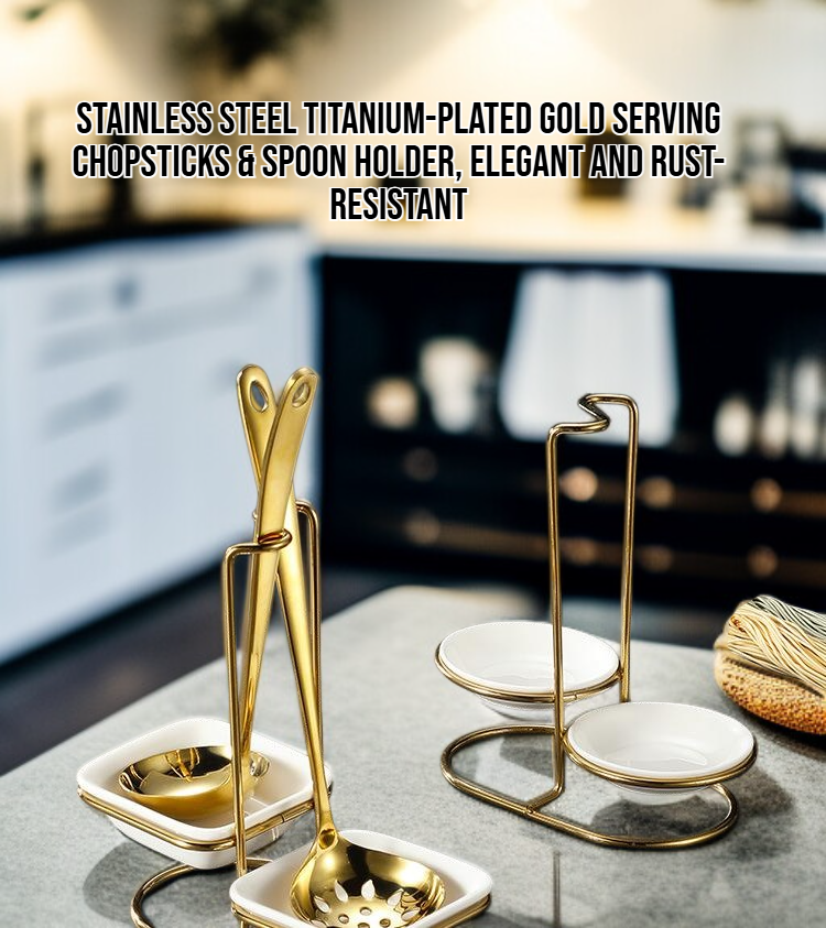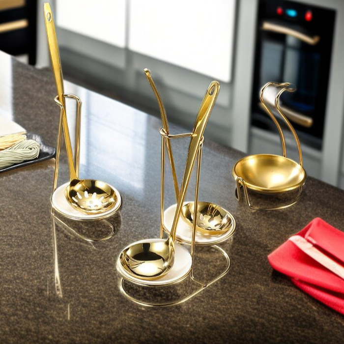 Durable stainless steel, titanium plated for corrosion resistance, elegant gold finish, space-saving spoon storage, easy to clean, modern kitchen organization.