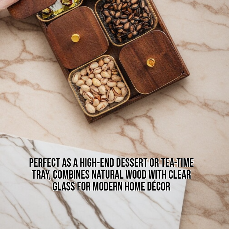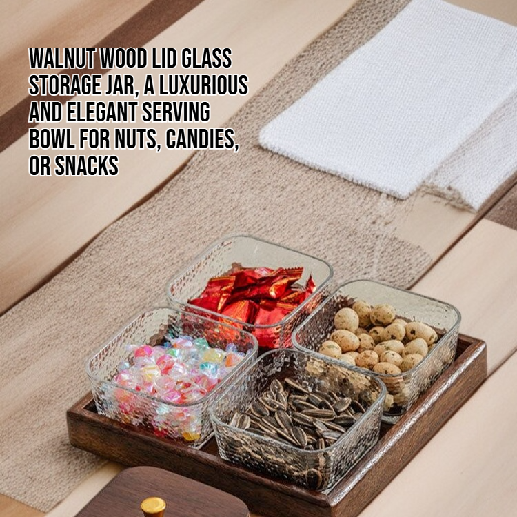 Glass storage box set with walnut lids, ideal for organizing kitchen essentials. Durable, airtight, and easy to clean. Enhances countertop aesthetics and preserves food freshness.