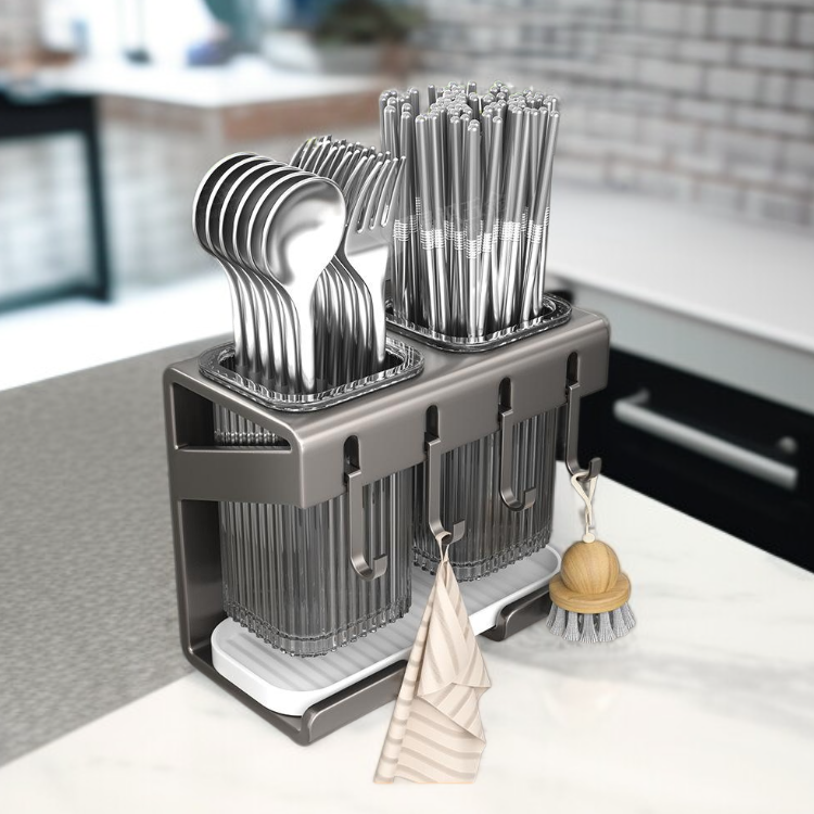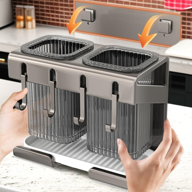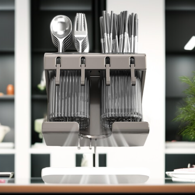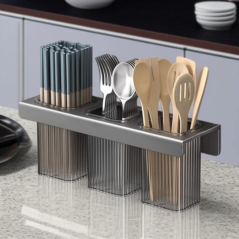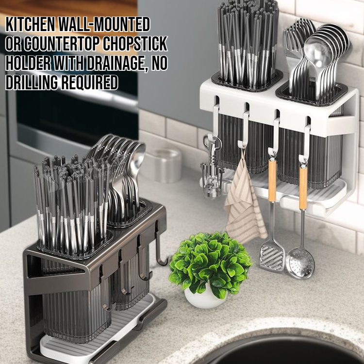 Wall-mounted chopstick holder with non-perforated installation, saves space, keeps chopsticks organized, easy to clean, durable material, ideal for modern kitchens.